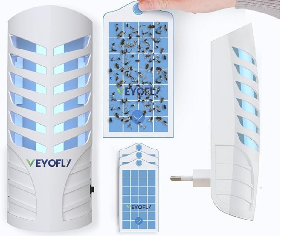 - Bandeja adhesiva (trampas UV pasivas): Las moscas quedan atrapadas en una superficie pegajosa sin usar electricidad.